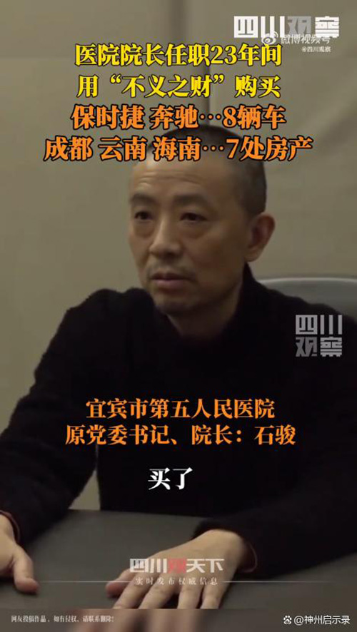 近日,四川宜宾市第五人民医院原党委书记、院长石骏在接受审查调查时,自曝了他的贪腐细节:在任职23年间,他利用职权,收受各种贿赂,用不义之财购买了8辆车、7处房产,其中包括保时捷卡宴等豪车,以及成都、海南等地的房产。这一消息引发了社会的广泛关注和强烈谴责,也暴露了一些医院领导的腐败问题和监管缺失。