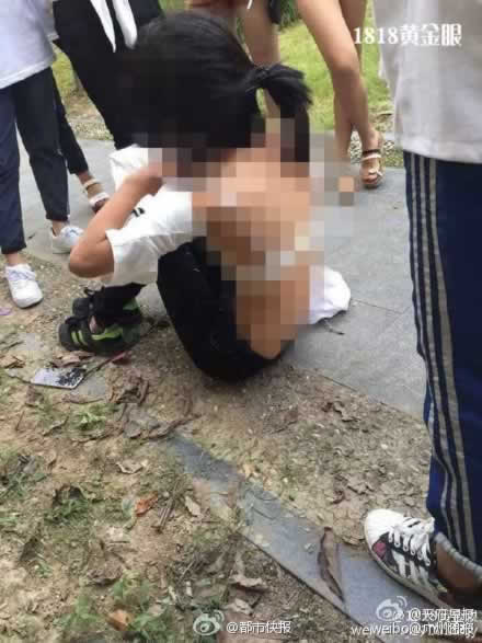 据介绍,一名身穿白衣迷彩裤的女生被推倒在草地上,蜷缩着身子。数名女生轮番上前猛踹17脚后,还揪其头发,数次掌掴受害女生。另外,受害女生裤子被脱掉,一女生边用树枝侵犯其下体,边对其讥讽凌辱。