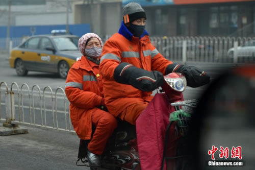 12月9日,北京市处于六级严重污染级别。图为雾霾中去工作的环卫工人。 中新网记者 金硕 摄
