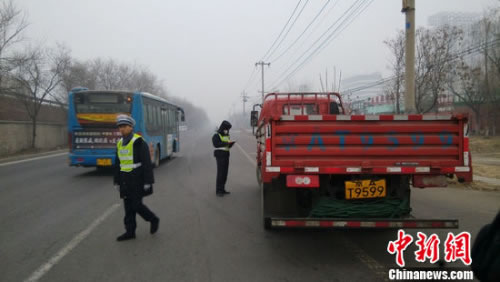 12月9日,北京市处于六级严重污染级别。图为交通协管员在雾霾中坚守岗位。 中新网记者 金硕 摄