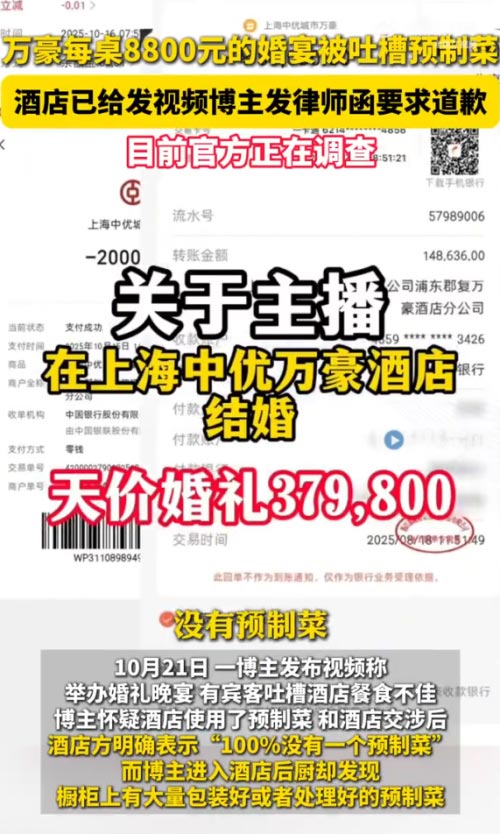 10月21日,一博主发布视频称,自己在上海中优城市万豪酒店举办婚礼晚宴,有宾客吐槽酒店餐食不佳,博主怀疑酒店使用了预制菜。