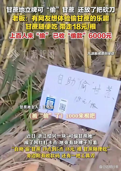 很快,一块写着 “自助‘偷’甘蔗,19 点到 5 点,18 元 / 根,甘蔗随便吃!” 的牌子立在了田边,旁边贴心地放着收款码和工具刀。王勇龙坦言,用 “偷” 字是为了还原童年记忆里的冒险感,而自助付款则是为了避免客人的难为情。这个看似大胆的创意,意外开启了一场人气爆棚的体验经济实验。