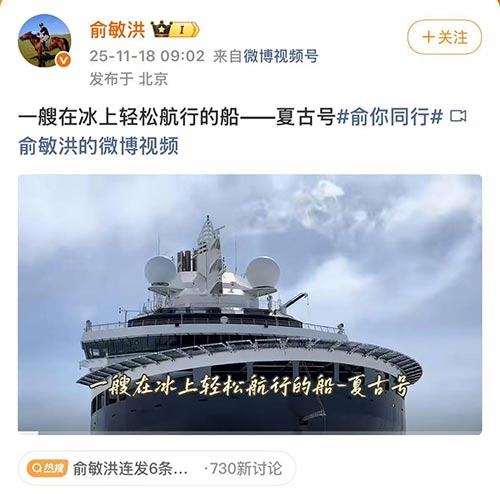 之后,俞敏洪在多个社交平台发布自己游玩南极的视频,截至目前已连续发布10条游玩视频。极目新闻记者注意到,他发布的视频透露自己乘坐了“一艘在冰上轻松航行的船——夏古号”。