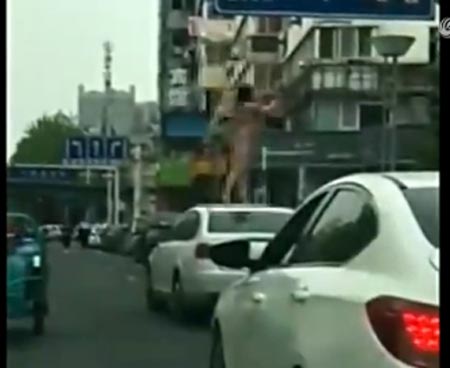 实拍:合肥妙龄女子二度裸奔后爬私家车顶视频