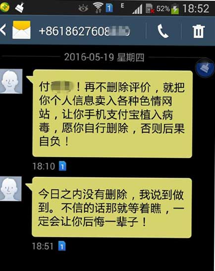 19日晚6时10分,内容为:“再不删除评价,就把你个人信息卖入各种色情网站,让你手机支付宝植入病毒。愿你自行删除,否则后果自负。”