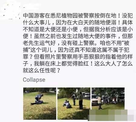 “赴日游客顺走马桶盖”的余波尚未散去,昨天,在澳洲悉尼的中国游客又爆出了“随地便溺,拒捕碰瓷”事件。