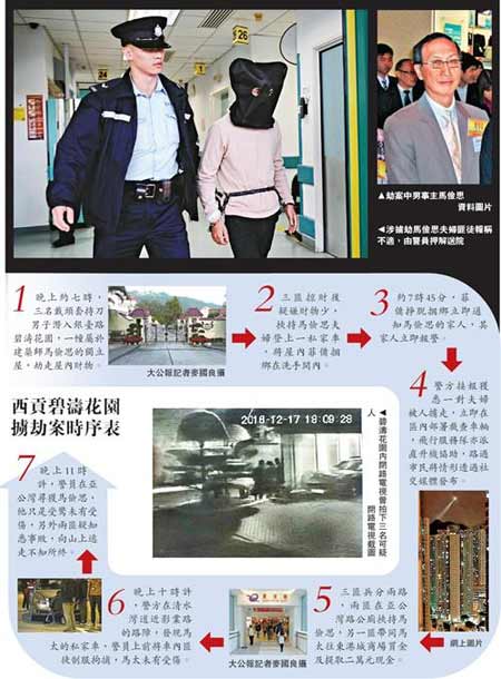 观塘警区刑事总督察邓志琛表示,前晚(17日)7时许,姓马男户主及妻子与菲佣都在屋内,马当时在二楼书房,其妻在地下大厅看电视,菲佣则在厨房工作;三名蒙面匪徒疑从二楼未有上锁的厕所窗闯入屋,以牛肉刀指吓马氏夫妇及菲佣,逼马打开睡房夹万掠去首饰及现金,贼人并将菲佣用毛巾捆绑及推入厕所。之后三匪疑嫌掠得财物少,挟持男女户主乘他们的座驾外出。
