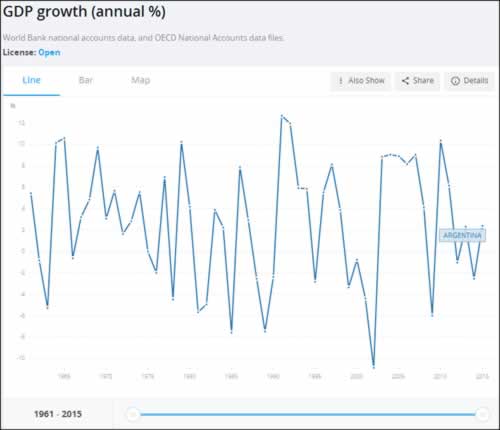 世界银行统计的从1961年-2015年阿根廷经济增长速度