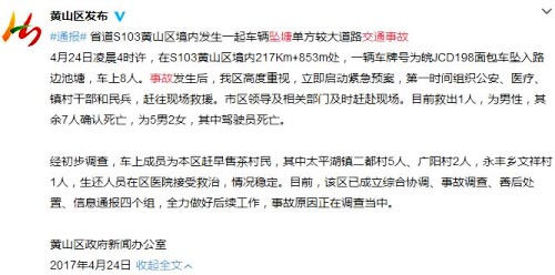 4月24日电据中共黄山区委黄山区人民政府信息办公室官方微博消息,24日,安徽省道S103黄山区境内发生一起车辆坠塘单方较大道路交通事故,造成7人死亡,1人受伤。