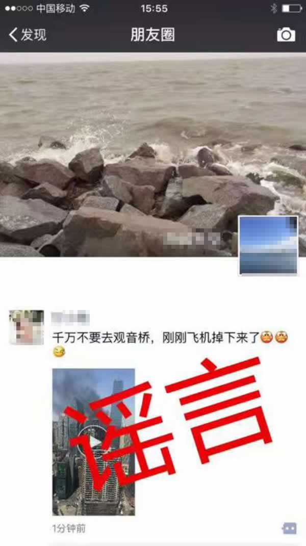17日,一段10秒钟的小视频在网络流传。视频显示,重庆市江北区观音桥附近浓烟滚滚,空中还盘旋着一架直升飞机。视频中,一名女子说:“千万不要来观音桥了,飞机刚刚掉下来了,好吓人哦。”