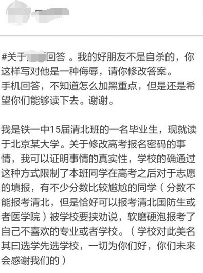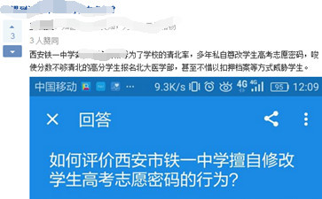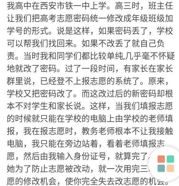 “知乎”某实名网友痛诉西安铁一中擅自修改学生高考志愿密码行为(截图)