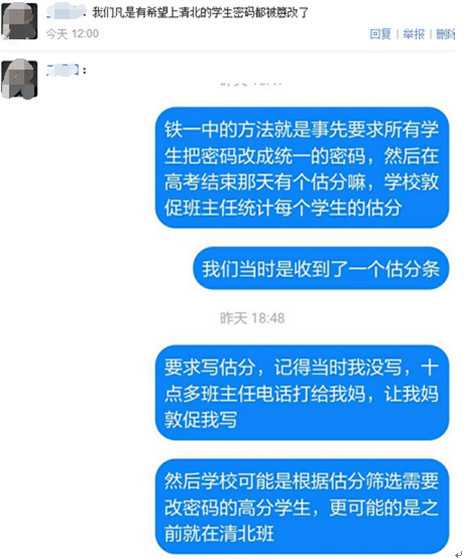 记者看到,在“知乎”、北大BBS等社交媒体上部分实名网友反映,西安铁一中老师在高考前修改学生高考密码,使得考生及家长无法及时登录高校志愿报名系统,而校方则对考生及家长保密学生密码,学生填报志愿时只能由学校老师代写,有些同学迫于校方压力而被迫选择了不喜欢的高校与专业,并深感不快。
