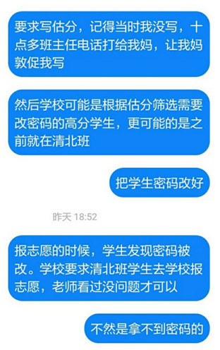 “学校更愿意修改清北班的考生志愿密码,对于高分考生学校尤其重视。” 李晓进一步透露,学校老师会找高分考生约谈,“指导”他们报专业,而这些专业有的是同学们自己根本不愿意去学习发展的方向。