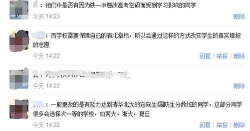 另有毕业于西安铁一中附近学校西安高新一中的网友孙兰(化名)接受记者采访透露,自己身边有不少西安铁一中毕业生,而西安铁一中通常更改有能力达到北京大学及清华大学定向生或者国防生分数线的考生高考志愿密码,这类学生通常会选择分数稍低一些的高校,上自己心仪的专业,而学校老师为了保证清华北大录取率,会劝说学生报名清华北大的定向生或国防生专业,但这些专业有时并不适合部分同学。
