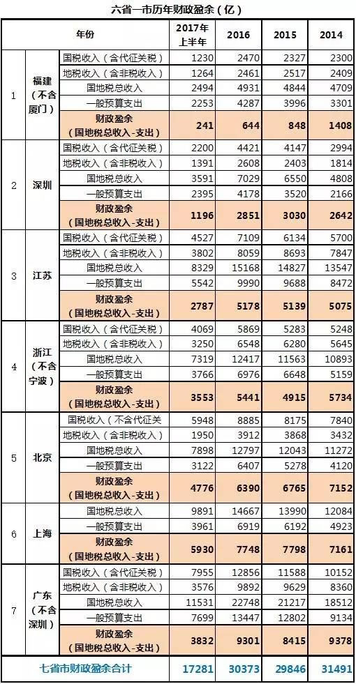 2016年,福建的财政盈余644亿,深圳2851亿,江苏5178亿,浙江5441亿,北京6390亿,上海7748亿,广东9301亿,合计起来,六省一市总共给中央财政带来了30373亿的贡献。但是,我们必须意识到,这种贡献规模已经达到了极限了,从2014年到2016年,六省一市合计的财政盈余幅度始终维持在3万亿左右。今年上半年的合计盈余规模1.7万亿,考虑到下半年的财政支出更大,预计今年这六省一市的财政盈余规模,也就是3万亿左右了。