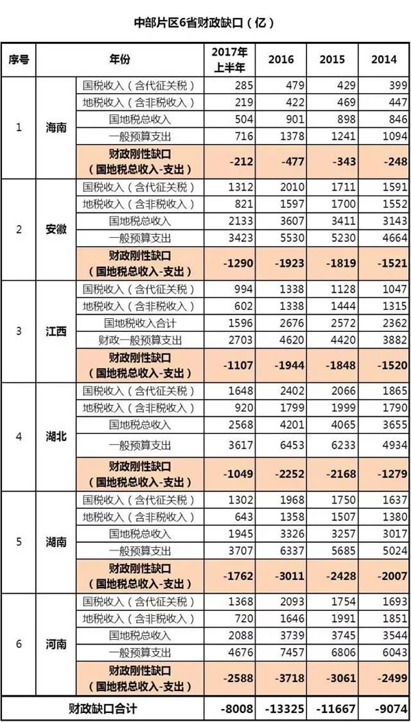 中部片区6省,海南、安徽、江西、湖北、湖南与河南(说明一下,海南实在是没片区合适放,所以放到了中部),基本上都是人口大省,当然也是财政缺口大省。