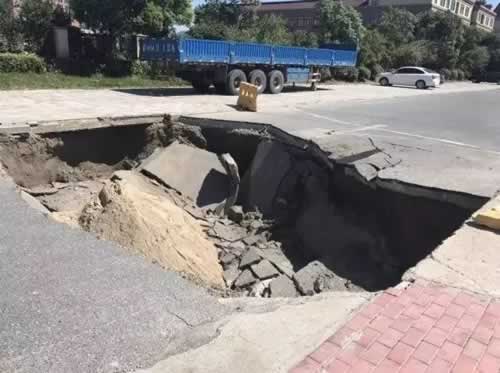 周围群众说这条路刚刚建好不到两年。据了解,前天早晨就有人发现该路段出现路面凹陷、开裂的现象,路东侧的两块路牙石崩开,透过缝隙可见路面底下有个深洞。