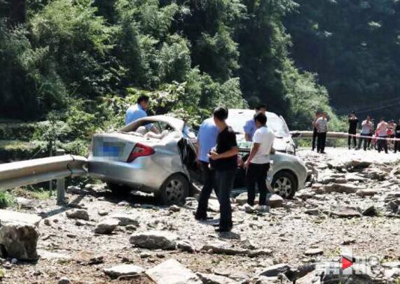 而事故中被砸坏的另一辆小车上的5个人因在滚石落下瞬间果断紧急刹车并弃车逃命,无一人受伤。