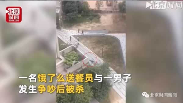 目击者告诉北京时间记者,当时听到外面有两名男子在争吵,随后听到“咚”的一声。目击者从阳台上看到外卖小哥倒地不起,旁边一名黑衣白鞋男子在骂骂咧咧打电话。