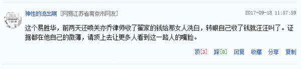 该网友质疑:这个易胜华,前两天还喷关亦乔律师收了翟家的钱给那女人洗白,转眼自己收了钱就汪汪叫了。证据都在他自己的微薄,请顶上去让更多人看到这一路人的嘴脸。