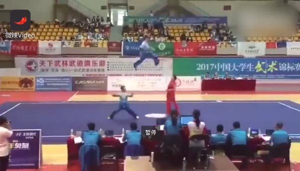 【一跃两楼高!大学生武术锦标赛厉害到上天】近日,2017年中国大学生武术锦标赛在湖南娄底举行。这段视频中,三人徒手对练,对抗激烈!空中动作飞上天,现场观众惊呆了,连连尖叫!