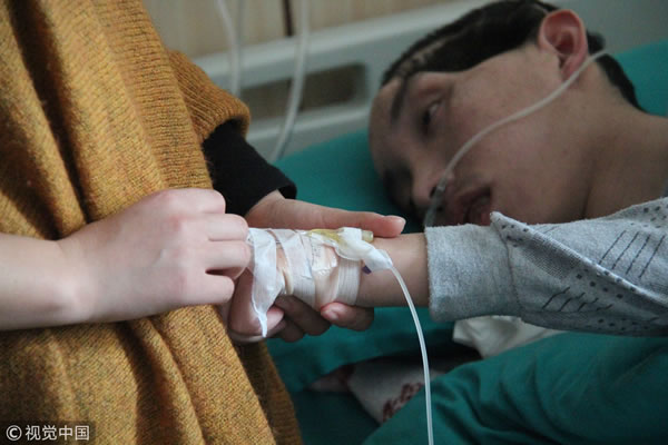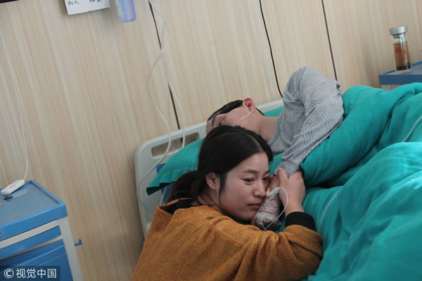 2017年11月2日,山东临沂,秦玉瓶在医院照顾弟弟。