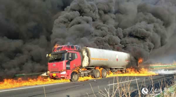 实拍黑龙江大庆一油罐车泄油起火