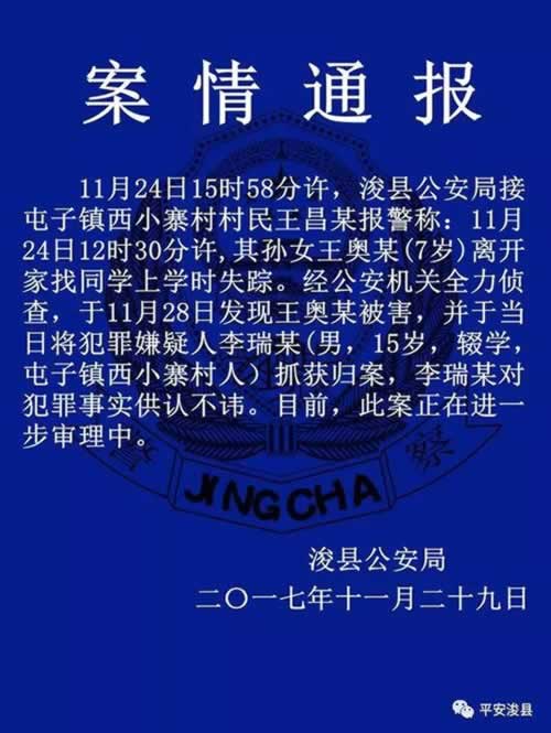 河南鹤壁市浚县屯子镇西小寨村7岁女童奥依(化名)11月24日在上学途中失踪。浚县公安局官方微信公众号“平安浚县”29日通报称,奥依已被害,疑犯是15岁同村辍学少年李瑞某,目前案件正在进一步审理中。