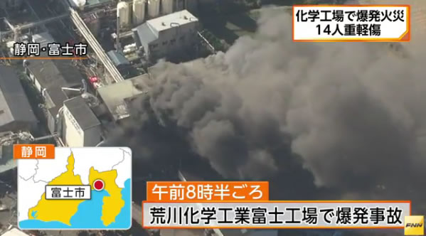 据称爆炸发生在该工厂北侧的建筑物内。荒川化学工业称,当时,工厂正在生产造纸用的化学药品和印刷油墨用树脂。因火灾中或产生大量有害物质,富士市已通知位于工厂周边100米范围的民众紧急避难。