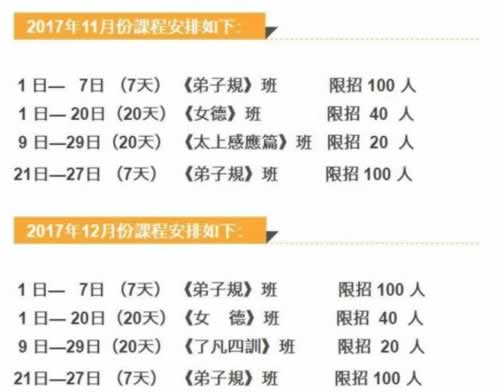 这些课程非常抢手,以招生信息发布的时间来看,仅用10天,一门《弟子规》课程就被报满了。