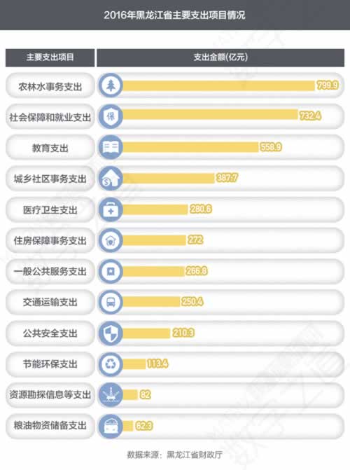 2016年,黑龙江省公共财政收入1148.4亿元,支出却达4228亿元。挣1000多亿花4000多亿,钱都花在哪里了?