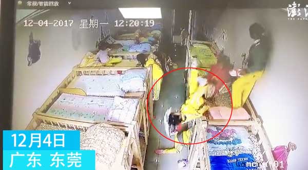 监拍东莞一女童接送站里打闹 一头从上铺栽下