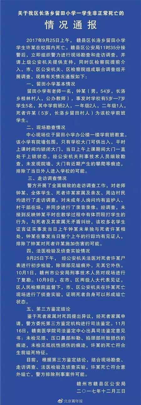 针对此事,今天,北青报记者从赣县区公安局获悉了一份警方通报,通报称,留田小学有老师一名,钟某(男,54岁,公办教师),事发时学校有5岁——7岁学生5名,其中学前班2人,一年级2人,二年级1人,死者许某(5岁)为该校学前班学生。