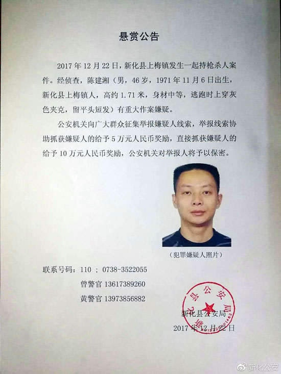 湖南新化县发生一起持枪杀人案