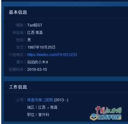 记者在@Tao韬GT的个人基本资料上看到,其上显示该网友的所在地为“江西南昌”,公司为“南昌市第二医院”,职位为“普外科”。