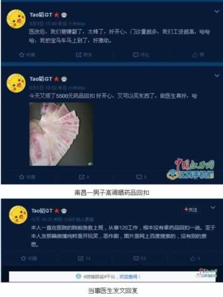 “今天又领了5500元药品回扣,好开心,又可以买东西了,做医生真好,哈”,12月26日下午,微博网友@Tao韬GT今年9月6日发布的一条微博被网友挖出,并引发热议。记者在该微博上看到,@Tao韬GT的个人资料显示,其所在地为“江西南昌”,公司为“南昌市第二医院”,职位为“普外科”。中国江西网记者就此联系上南昌市第二医院,当晚,医院方面回复记者,该男子系该院肛肠科龚姓医生,一直派往120驻点从事院前急救,经调查,网上所发不属实,本人说是好玩,图片从网上下的。与此同时,当事医生本人也在网上发帖作出说明。