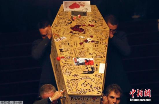 当地时间2015年1月15日,法国蒙特勒伊,《查理周刊》杂志的同事亲友在遇难的卡通画家Bernard Verlhac又名:Tignous的棺材上画画。人们为遇难的漫画家举行葬礼。