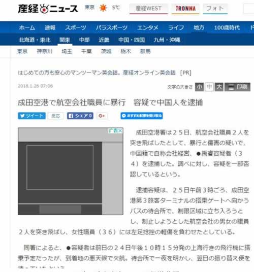 “一名中国籍男子25日在东京成田机场涉嫌对2名航空公司职员施暴,当天已被成田机场警署拘捕。”今天一大早,日本多家主流媒体刊登了这样一条简短的消息。