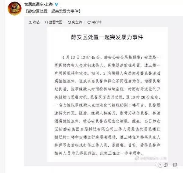 上海市公安局官方微博2017年4月14日发布消息称:“4月13日13时45分,静安公安分局接报警,安远路一居民楼内有人击发钢珠伤人。民警迅速前往处置,遭三楼一户居民阻碍和攻击。期间,3名嫌疑人突然向处警民警泼洒腐蚀性液体,造成多名民警和群众不同程度灼伤。增援民警赶到后,犯罪嫌疑人时而投掷砖块空瓶、时而打开液化气开关继续与民警对抗。民警反复进行劝说,至18时20分左右,一名女性犯罪嫌疑人点燃液化气钢瓶扔到二楼平台,民警迅速将火扑灭。随后,嫌疑人持菜刀、剔骨刀砍伤民警,并泼洒腐蚀性液体,被公安民警当场击伤制服……”