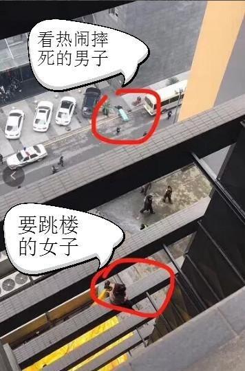 这名女子想不开,想要轻生离开人世,跳楼可不是一件容易的事情,就在生死攸关纠结的时刻,情景倒转,谁能想得到有下面的结局?对面看热闹的人失足掉了下去,想轻生的人成了看热闹的旁观者,而看热闹的旁观者却成了坠楼者。