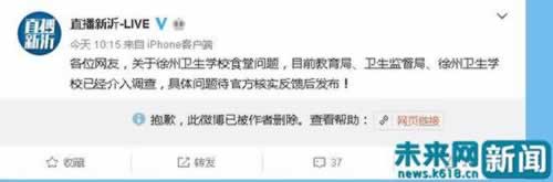 记者找到爆料徐州卫生学校食堂卫生存在问题的微博,发现该微博已被作者删除,取而代之的是,一篇新的微博,该微博表示,“关于徐州卫生学校食堂问题,目前教育局、卫生监督局、徐州卫生学校已经介入调查。”