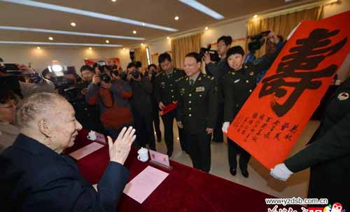 中新社石家庄2月2日电 新中国开国将军、河北省军区原政治委员曾美,因病医治无效,于1月31日在石家庄市白求恩国际和平医院逝世,享年101岁。早在2013年3月26日,曾美老人迎来百岁寿辰。历尽岁月风云变更的他,亲笔写下百岁愿望:我希望世界和平。以下为2013年3月26日中新社《开国将军曾美百岁寿诞》文章,原文如下: