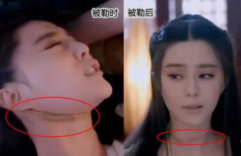 《武媚娘》5大穿帮镜头第三穿帮镜头:第六集武如意独自到承庆殿遭遇刺客勒脖子,绳子本来是紧勒其颌骨下方的,在其被救后,勒痕往下移到了肩膀上脖子处。