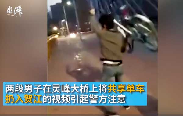 实拍广西贺州4男子扔共享单车入江拍视频:想当网红