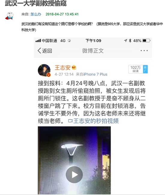 网曝武汉一副教授到女生厕所偷窥拍照 被发现后跳楼逃脱