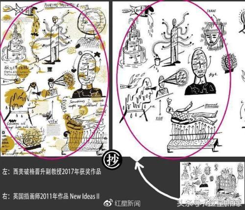 文章称,其作品涉嫌抄袭英国插画师 Russell Cobb2011年的作品《NewIdeasII》和《Notetalking》,并给出了作品比图。从中可以看到,樊姓教师的作品中很多元素均和该插画师的作品相差无几,只是在部分区域晕染了一些色彩 。