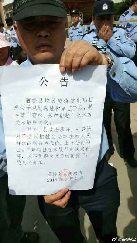 网传,据微博网友@黄登光军:去年7月骗老百姓垃圾焚烧项目立即废止,今年又偷偷上马。老百姓抗议后又来个公告绝不开工,故技重施。这个盖有高领乡政府的公章发出来的公告高领人民是不会信的。