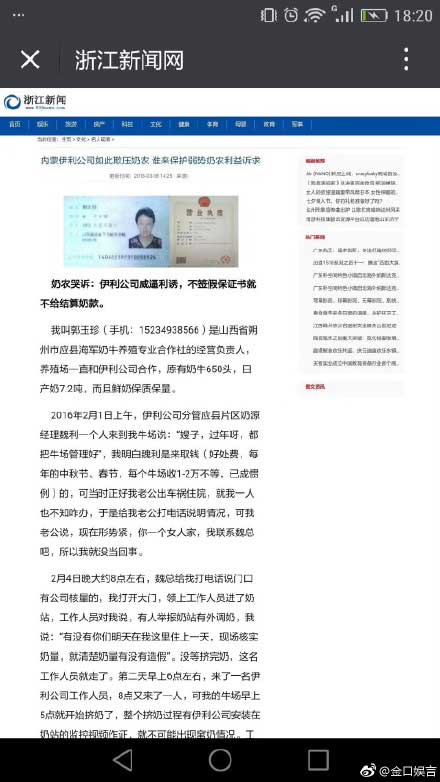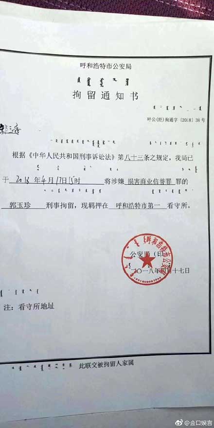 近日,网上流出一张呼和浩特市公安局的拘留通知书:根据《中华人民共和国刑事诉讼法》系八十三条之规定,我局已2018年4月17日15时将涉嫌损害商业信誉罪的郭玉珍刑事拘留,现押在呼和浩特市第一看守所。据悉,郭玉珍,山西省应县供奶商,前段时间曾因一篇《奶农哭诉伊利公司威逼利诱 不签假保证书就不给结算奶款》引发网友关注。