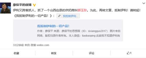 据微博认证专栏作家自媒体人@廖保平的刚刚发出的微博消息:伊利又跨省抓人,抓了一个山西应县的供奶商叫郭玉珍。为此,再转文章,抵制伊利!请转起!《我抵制伊利的一切产品!》