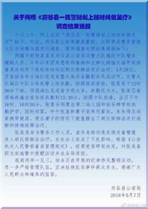 经调查,网曝中的张某某系府谷县公安局交警大队城区中队警务辅助人员。今年以来因其患有颈椎病和左脚大拇指灰指甲疾病曾多次利用下班轮休时间到修脚店进行治疗。